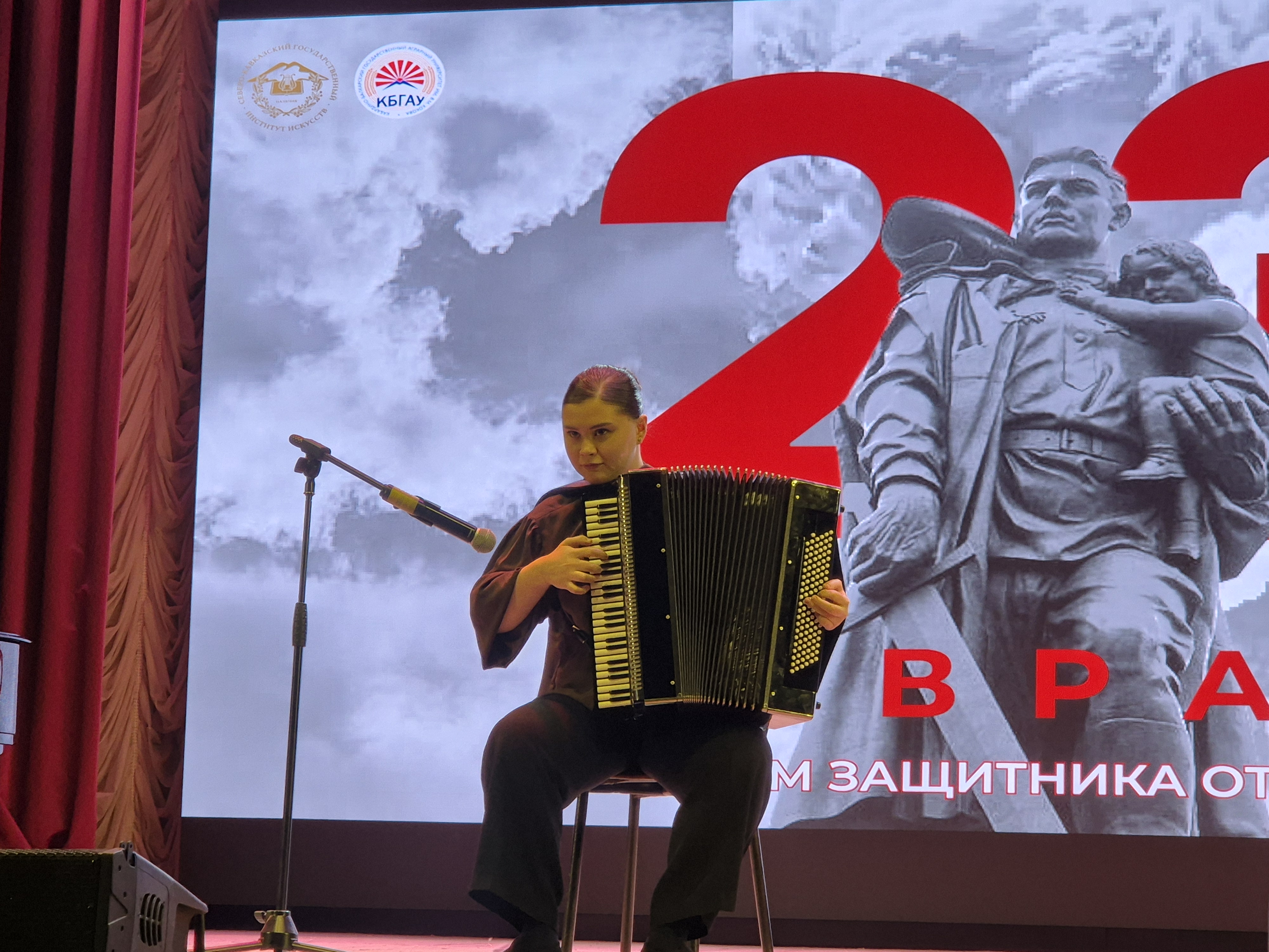 В конце минувшей недели в актовом зале Северо-Кавказского государственного института искусств состоялся совместный праздничный концерт, объединивший студентов и преподавателей двух ведущих вузов республики: СКГИИ и Кабардино-Балкарского государственного аграрного университета имени В.М. Кокова. Мероприятие было приурочено к предстоящему Дню защитника Отечества.