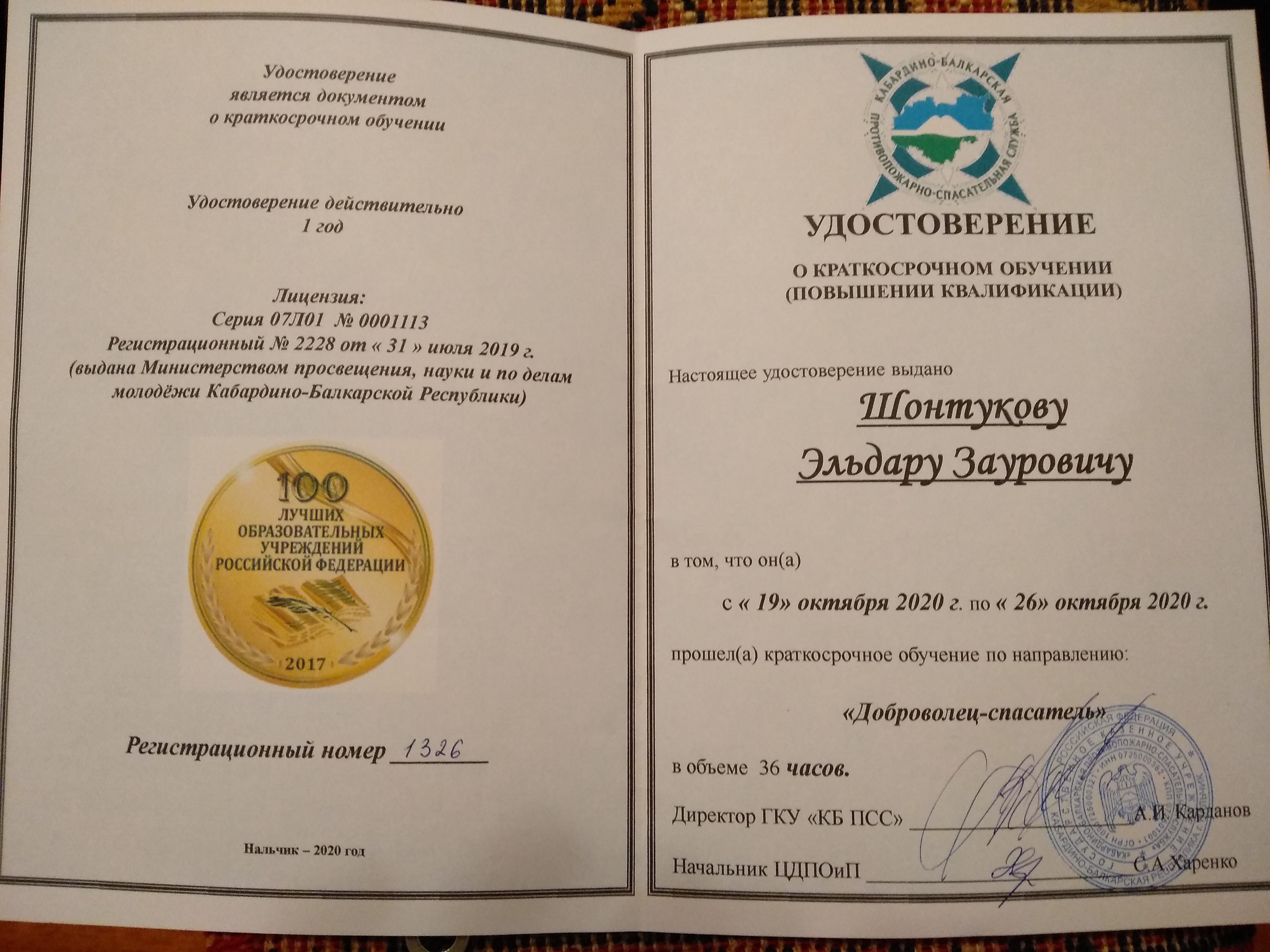 С 19 по 26 октября председатель Студенческого совета Кабардино-Балкарского ГАУ Эльдар Шонтуков прошел курсы в Центре дополнительного профессионального обучения и подготовки по гражданской обороне, защите от чрезвычайных ситуаций, пожарной безопасности и безопасности людей на водных объектах.