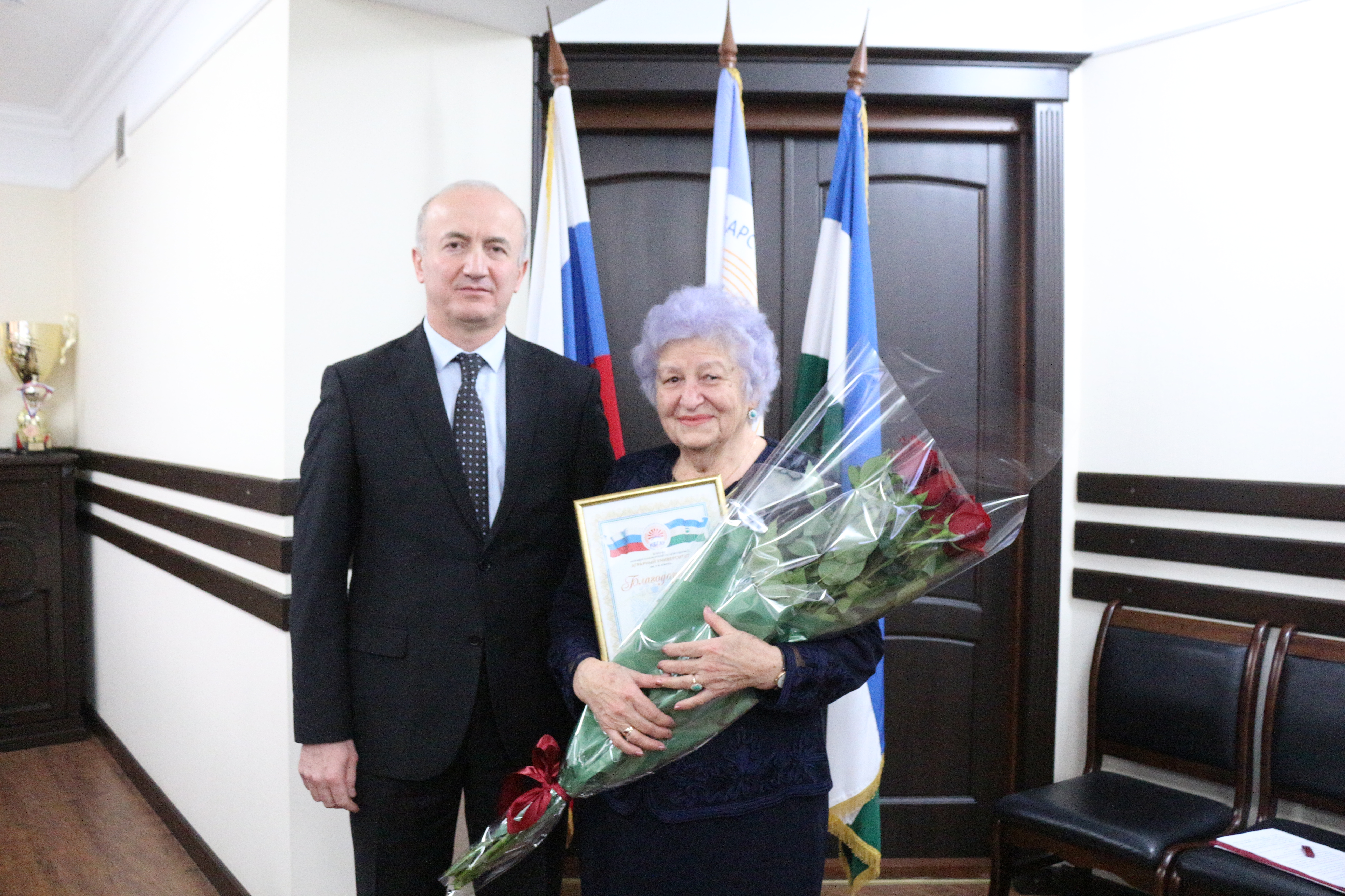 Ректор вуза Аслан Апажев поблагодарил Мемунат Адибовну за многолетний добросовестный труд, вручил Благодарность и букет цветов.