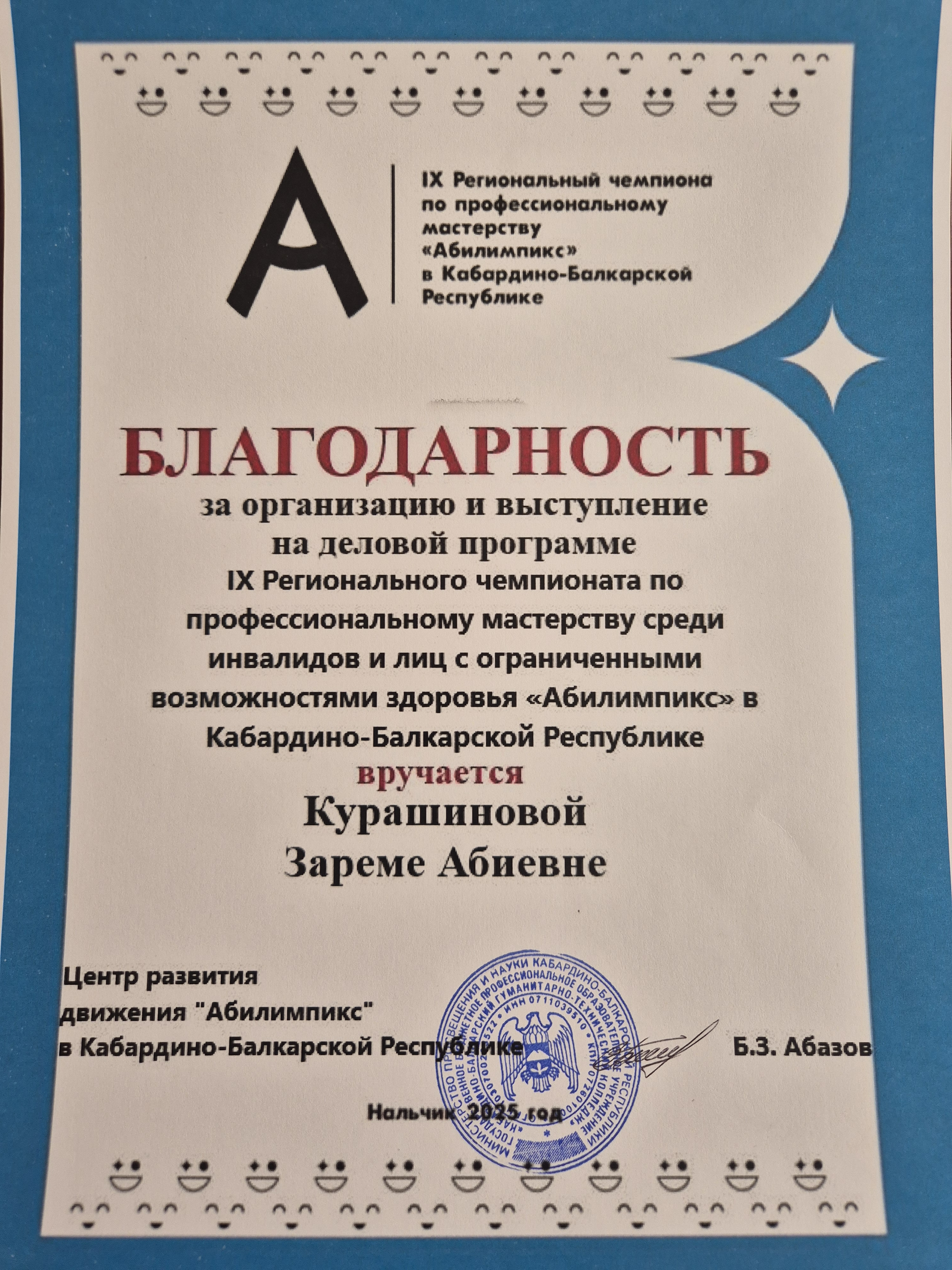 За организацию и выступление на деловой программе Зарема Курашинова отмечена благодарностью Центра развития движения «Абилимпикс» в Кабардино-Балкарской Республике.