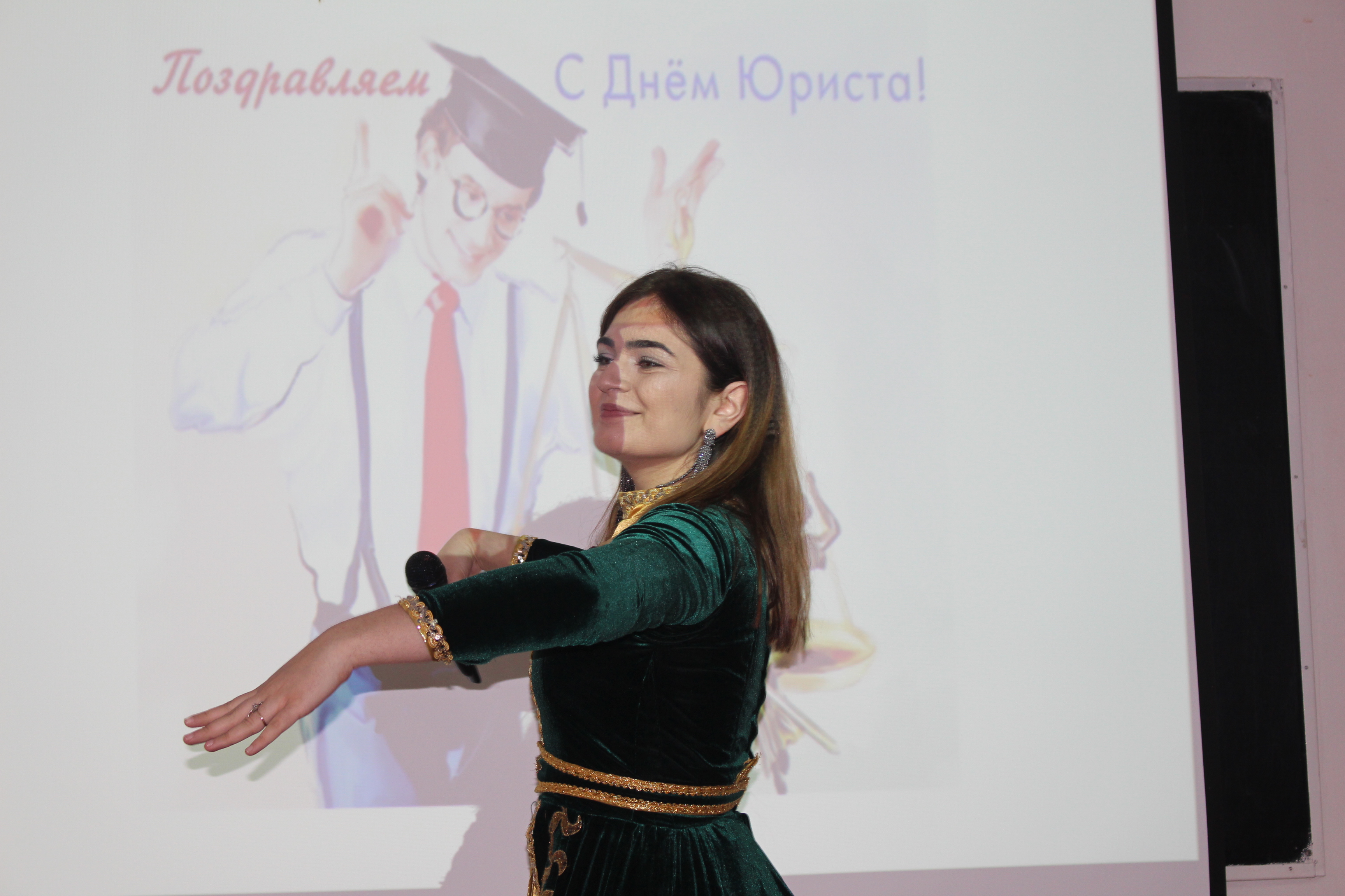 В этот день со сцены звучали слова признания, адресованные известным служителям Фемиды. Первокурсница Милана Гучапшева подготовила интересную презентацию о выдающемся юристе, известном политическом деятеле, докторе юридических наук, профессоре, основателе саратовской школы гражданского права, экс-министре юстиции РФ, первом председателе Международной Черкесской Ассоциации - Юрии Хамзатовиче Калмыкове.