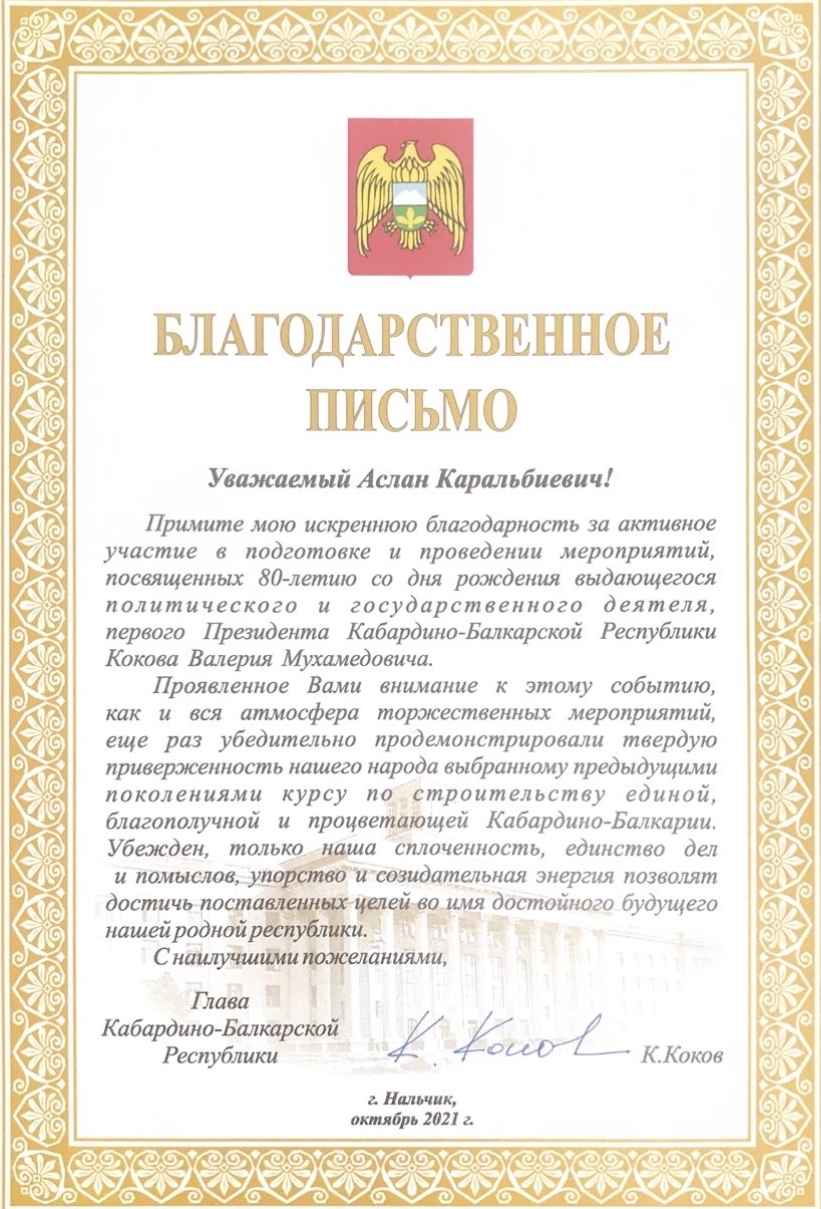 Благодарность от Главы Кабардино-Балкарской Республики Казбека Кокова