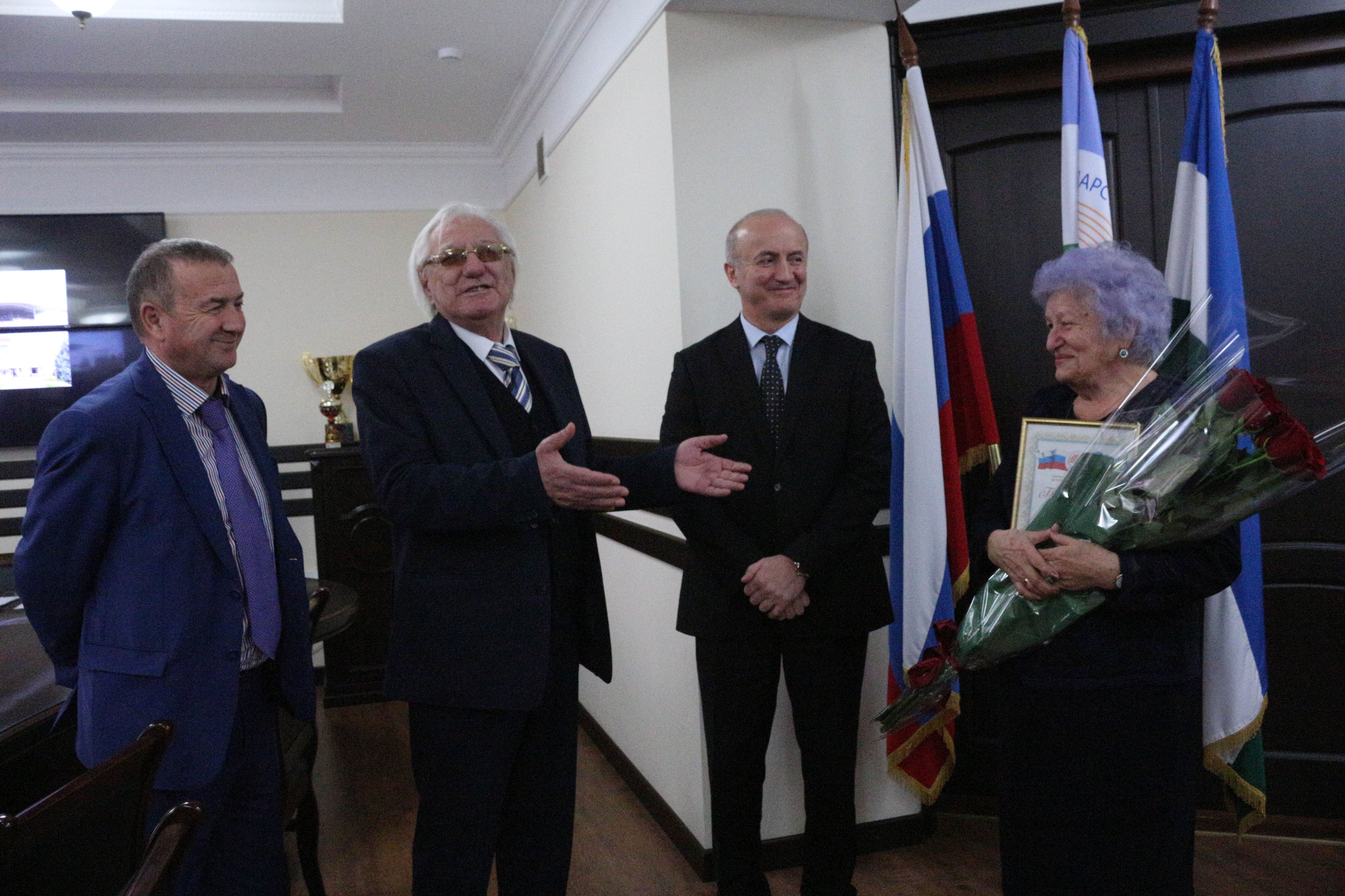 Ректор вуза Аслан Апажев поблагодарил Мемунат Адибовну за многолетний добросовестный труд, вручил Благодарность и букет цветов.
